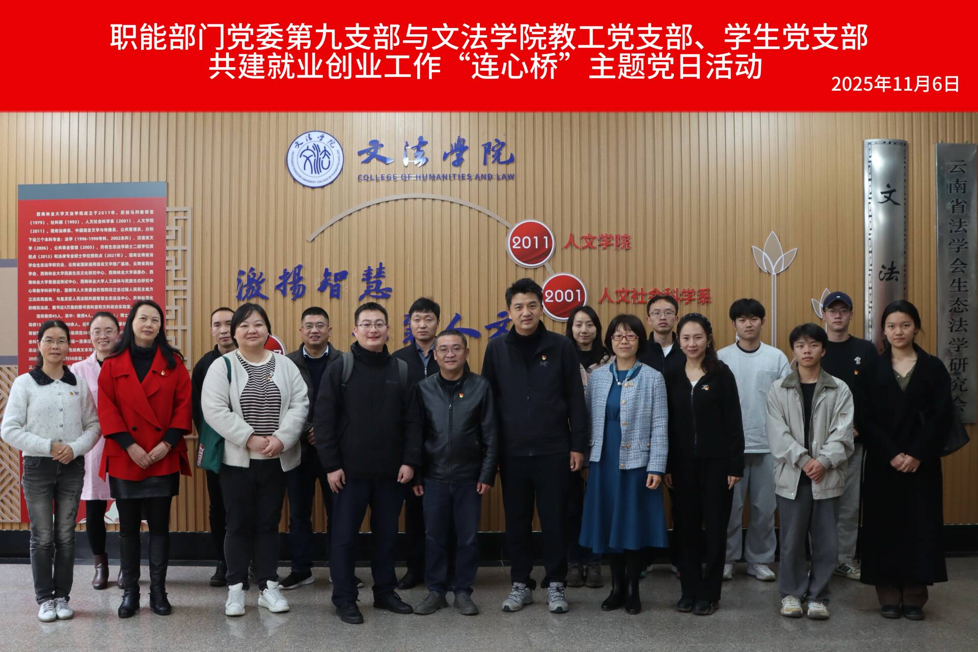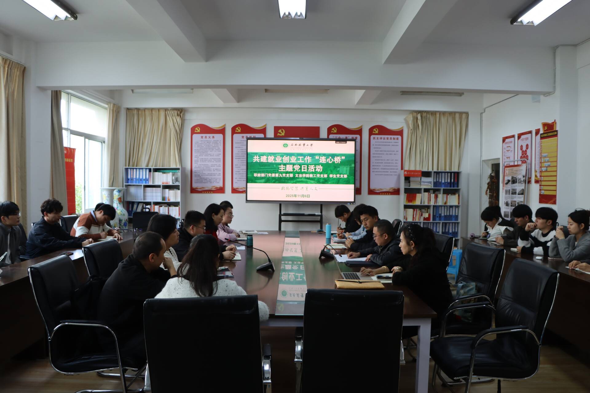 11月6日下午,职能部门党委第九支部与文法学院教工党支部、学生党支部联合举办共建就业创业工作“连心桥”主题党日活动。图书馆(档案馆、校史馆)班子成员、职能部门党委第九支部党员,文法学院教工党支部党员、学生党员及入党积极分子共同参与活动。活动由文法学院党委书记杨欣主持。