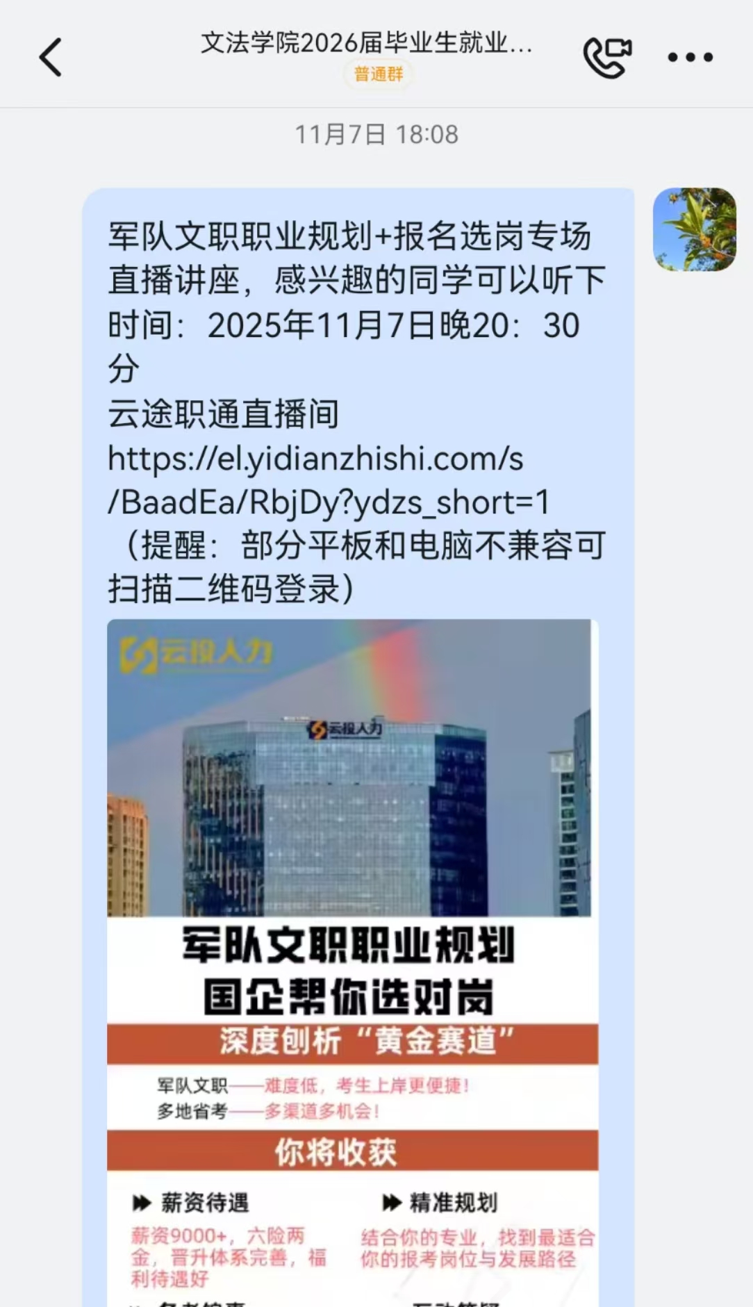 当晚,文法学院学生参加了由张立主讲的“军队文职报考选岗与政策解读”专场直播讲座。讲座内容涵盖政策深度解读、报考选岗策略及央国企就业趋势分析,为学生提供了精准的就业指导。