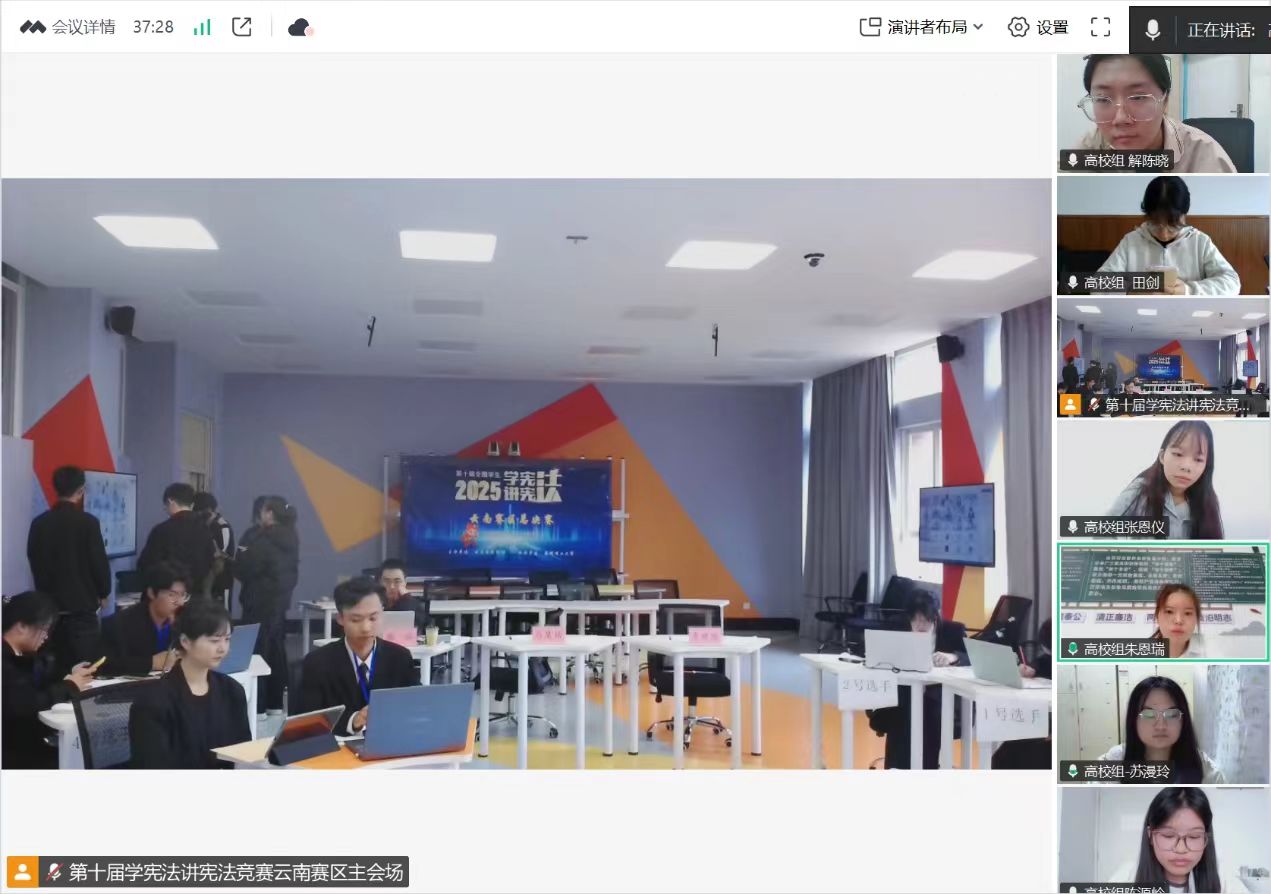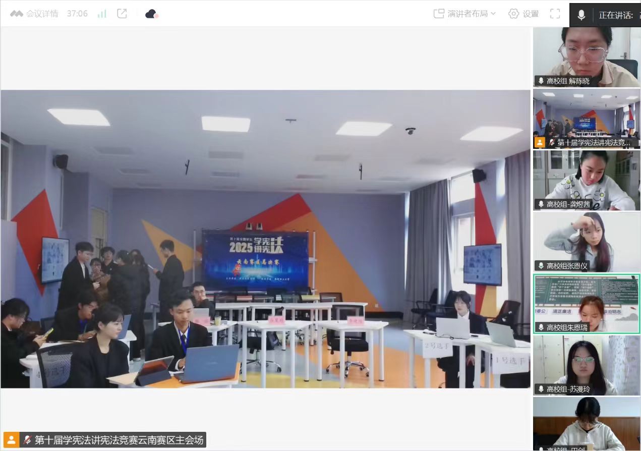 为深入学习贯彻法治思想,弘扬宪法精神,提升青少年法治素养,11月8日,由昆明理工大学主办的“学宪法 讲宪法”主题比赛初赛在线上成功举行。本次活动共吸引了来自学校各院系的数百名学子踊跃报名,其中文法学子积极响应赛事号召,以饱满的热情展现了对宪法学习的重视与践行。线上竞赛环节氛围热烈,答题过程中选手们思路清晰、表达流畅,充分展现了当代大学生尊崇宪法、学习宪法、践行宪法的浓厚氛围与良好精神风貌。