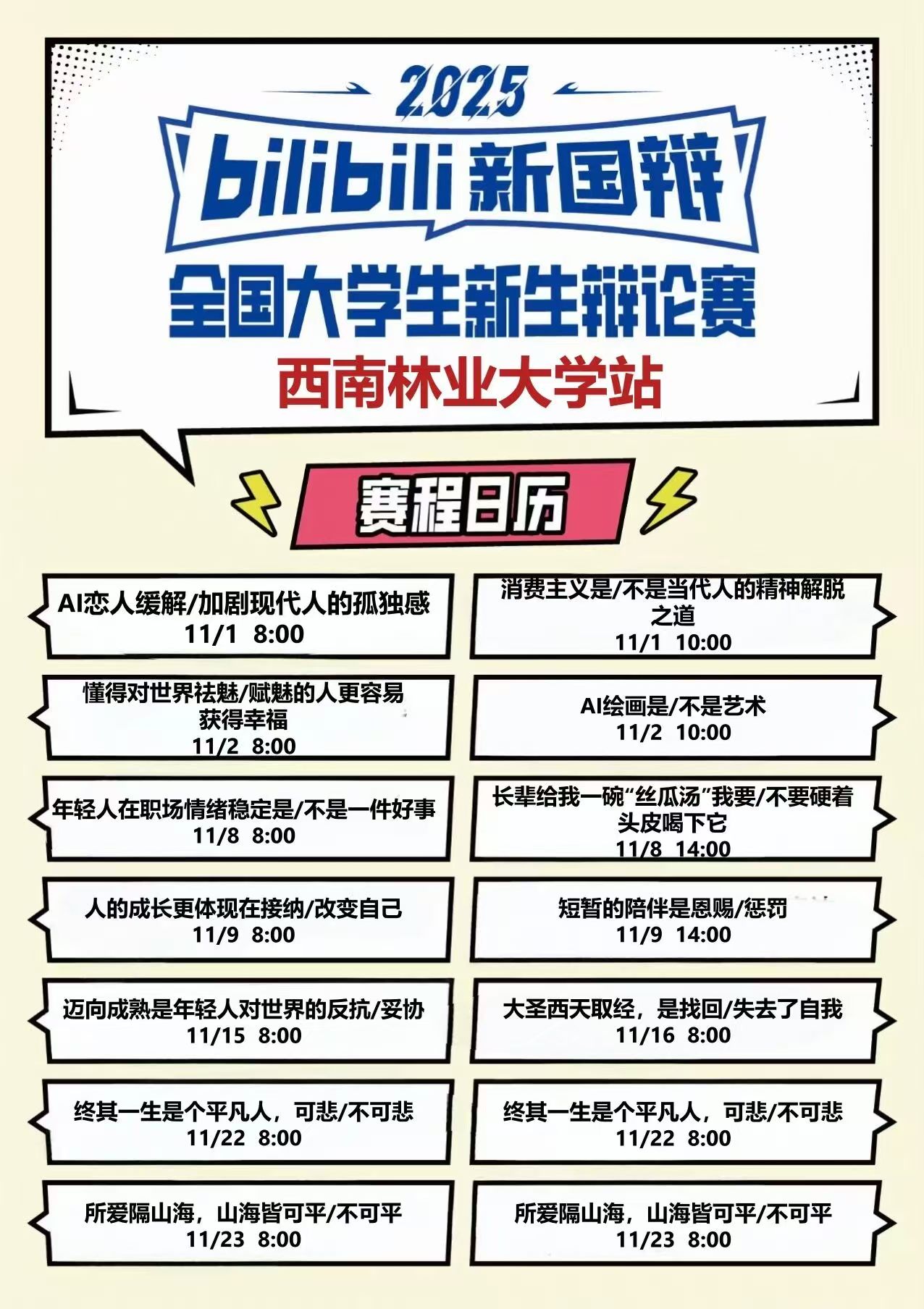 11月1日,由西南林业大学与bilibili新国辩赛事组委会联合主办、校辩论队与文法学院辩论队共同承办的2025年“bilibili新国辩全国大学生新生