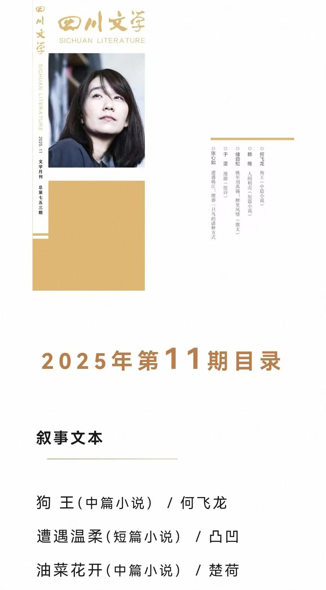 近日,西南林业大学文法学院何飞龙老师的中篇小说《狗王》在《四川文学》杂志2025年第11期发表。这篇小说以“狗”的视角展开,用细腻的笔触勾勒出一段跨越乡村与城市的生命旅程,字里行间满是治愈与怅然,引发读者对生命、陪伴与归属感的深度思考。