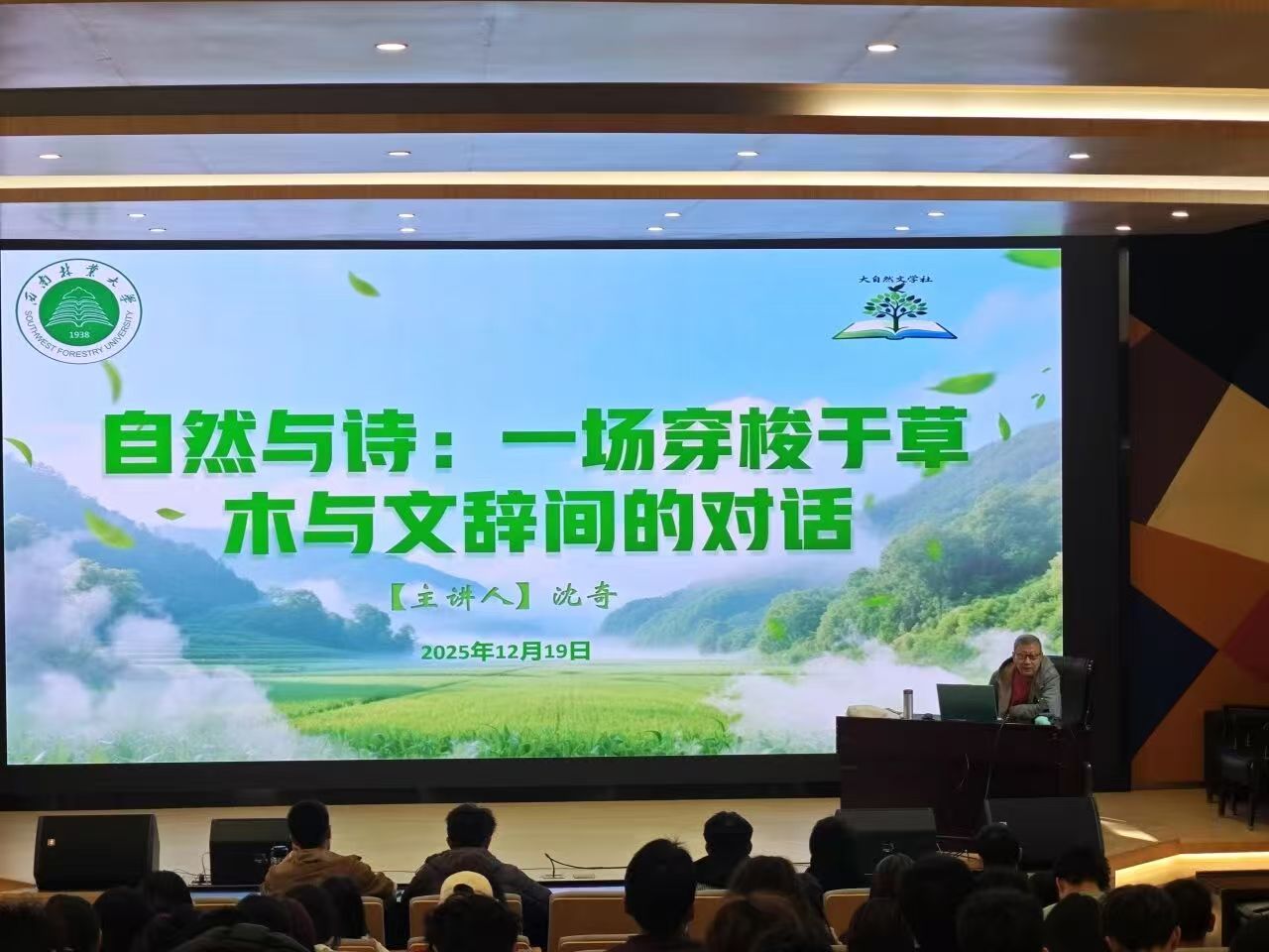 12月19日,西南林业大学大自然文学社邀请诗人、中国作家协会会员、北京大学中国诗歌研究院研究员沈奇老师,在北图小报告厅开展了一场题为《自然与诗:一场穿梭于草木与文辞间的对话》的专题讲座。本次活动由大自然文学社策划组织,社长马文丽同学主持,吸引了校内外众多热爱文学、钟情自然的师生参与。现场座无虚席,气氛热烈。