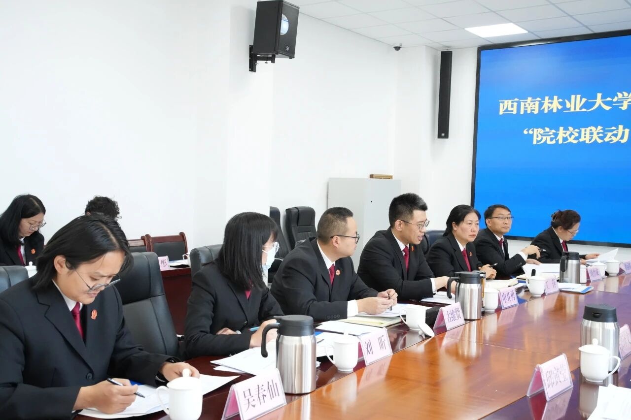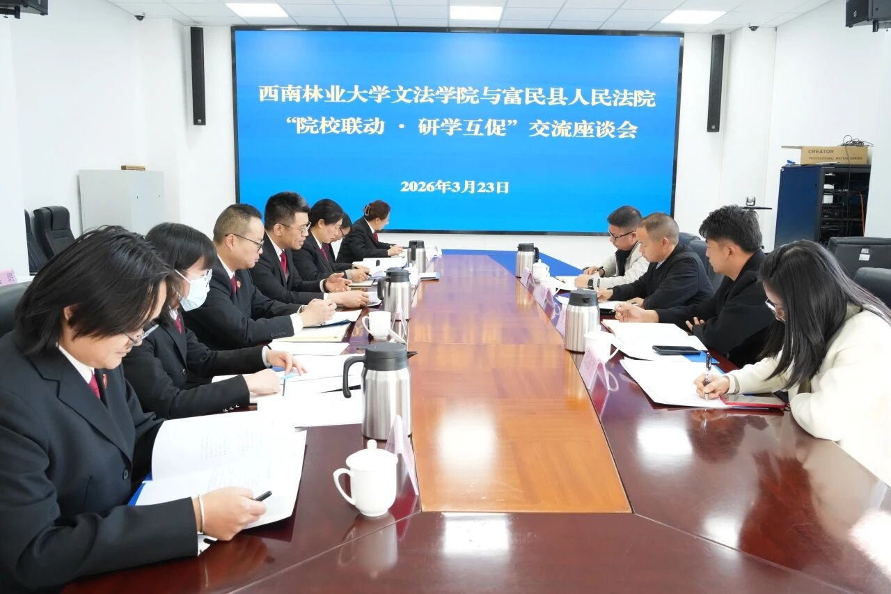 3月23日,文法学院院长李国新一行到富民县人民法院开展“院校联动·研学互促”交流座谈。学院党委副书记张译文、法律系教师代表,法院全体党组成员及相关部门人员参与座谈。会议由富民县人民法院党组书记、院长、学院03级法学专业校友申开勇主持。
