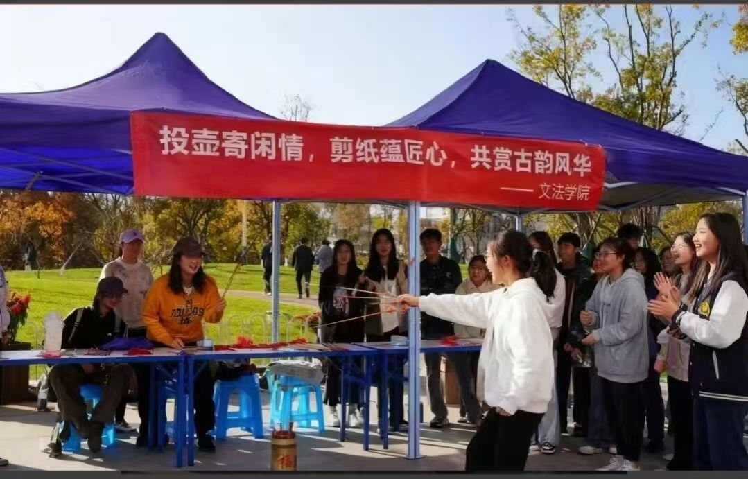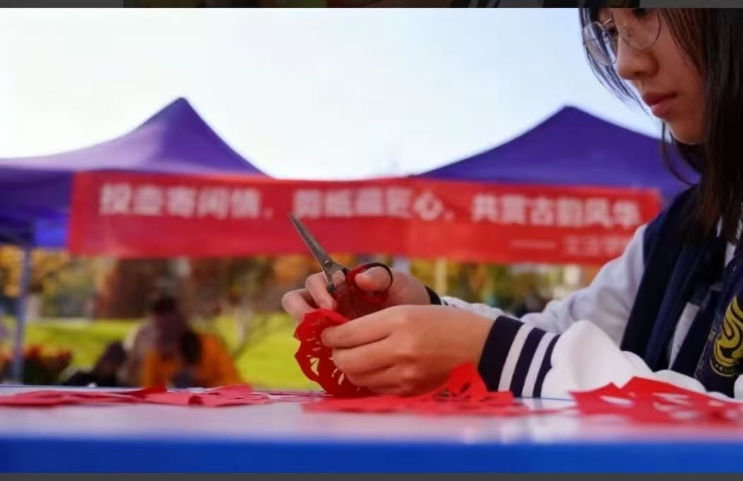 次日,橡苑餐厅广场变身传统文化体验阵地,“雅韵流芳 文脉寻踪”主题活动精彩上演。投壶体验区里,志愿者细致讲解投壶的起源与礼仪,参与者在1.5米外屏气凝神投掷箭杆,入壶的清脆声响伴着阵阵欢笑;剪纸工坊内,红宣纸、安全剪刀整齐摆放,志愿者从对折、描边到剪刻全程教学,同学们创作出福字、生肖、花草等精美剪纸作品,在指尖操作中感受传统手工艺的独特魅力,让非遗文化在校园里鲜活起来。