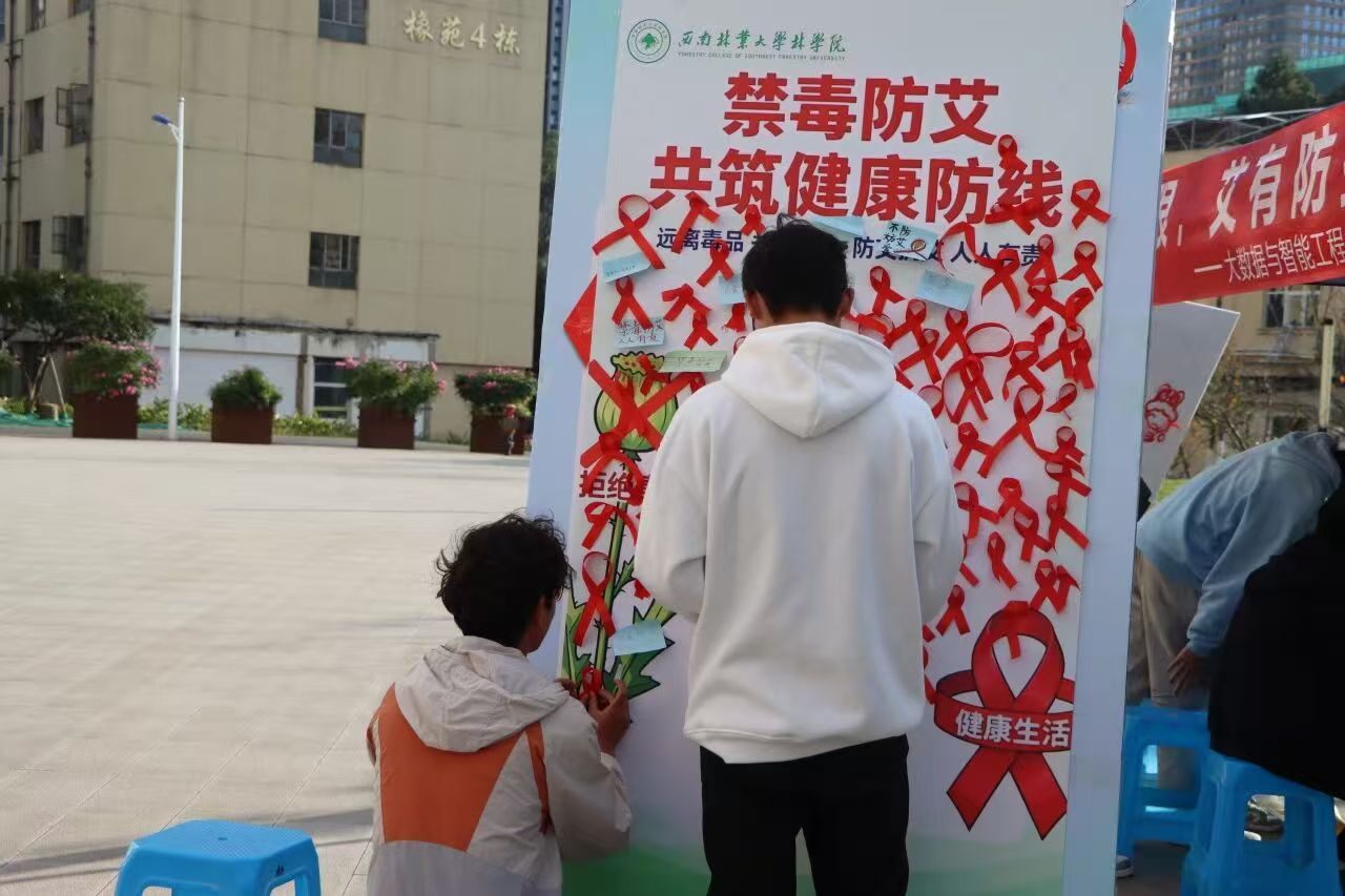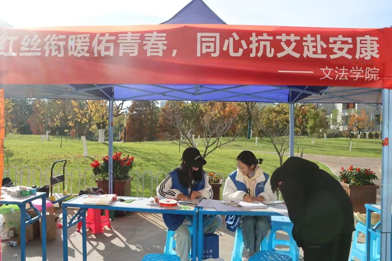 12月1日恰逢第38个世界艾滋病日,“青春红丝带,防艾不防爱”主题活动率先在橡苑餐厅广场拉开帷幕。活动以“社会共治,守正创新,终结艾滋”为导向,设置防艾知识答题区与红丝带DIY区:师生们通过答题学习艾滋病传播、预防和救助的核心知识,答对即可领取小礼品;志愿者还手把手指导大家制作红丝带,亲手系上的红丝带或粘贴在主题展板上的爱心符号,成为传递关爱、反对歧视的暖心标识。现场的宣传展板与防艾手册,也让科学防艾的理念更深入人心。